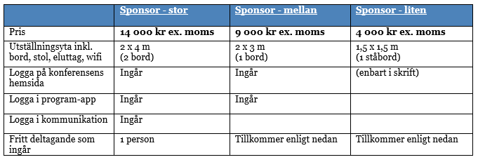 Utställarkort: 1200 SEK + moms/pers/båda dagar
